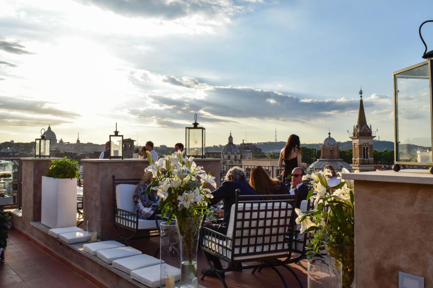 Suite Deluxe con Vista. Suite climatizzata con vista sulla cittĂ , sulla Basilica di San Pietro o su Piazza Navona, arredi eleganti, soggiorno e bollitore. Il bagno include accappatoi, pantofole,di cortesia e asciugacapelli. Alcune suite vantano un soffitto con travi di legno a vista. ;