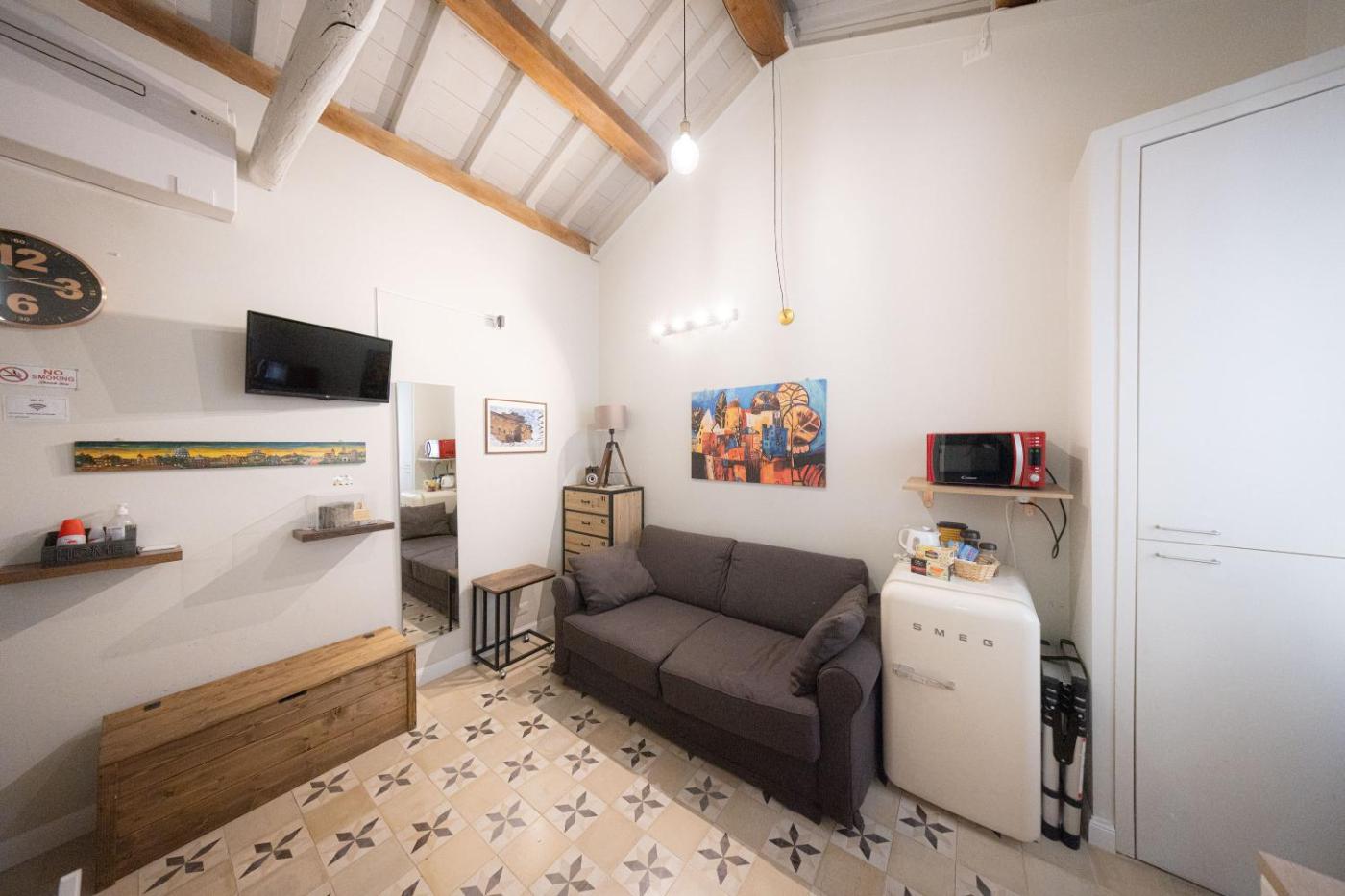 Appartamento Monolocale. Featuring a private entrance, this air-conditioned apartment consists of a kitchenette, 1 bedroom and 1 bathroom with a shower and a hairdryer. The kitchenette is equipped with a stovetop, a refrigerator and a microwave. The apartment provides a tea and coffee maker, a seating area, a wardrobe, a flat-screen TV with cable channels, as well as a quiet street view. The unit offers 2 beds.