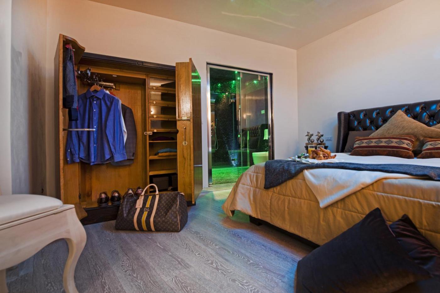 Ampia Camera Matrimoniale. Ampia camera moderna con arredi di design e dettagli unici. La sistemazione dispone di WiFi gratuito, aria condizionata e TV LCD satellitare ad alta definizione da 42 pollici con canali Sky. Il bagno interno è munito di accappatoi, bagno turco e doccia idromassaggio con cromoterapia. ;