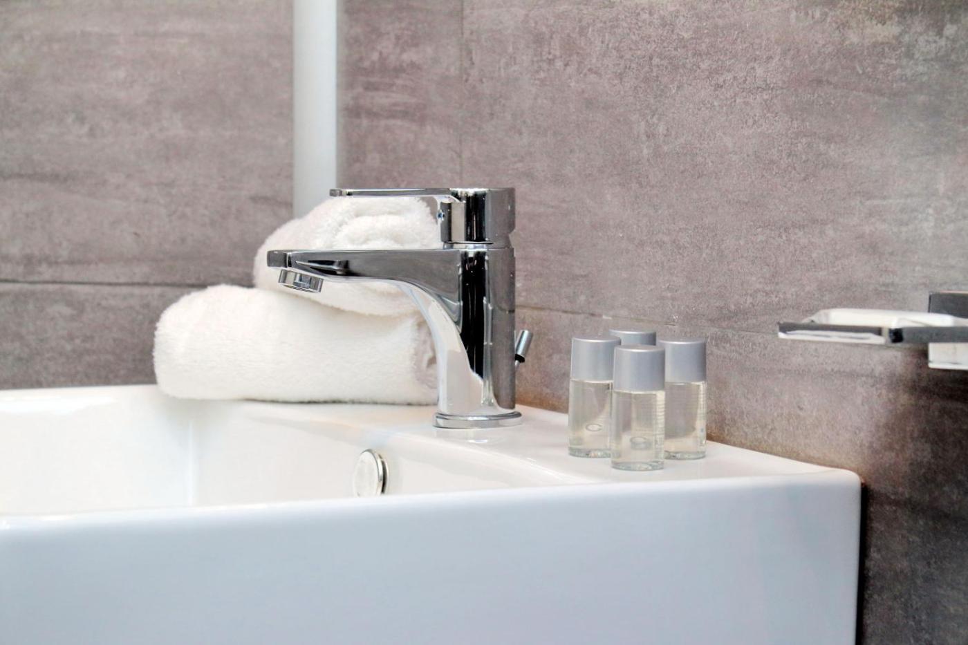 Camera Tripla Deluxe con Bagno Privato. Camera tripla dotata di bagno privato con doccia, asciugacapelli,di cortesia e bidet. Dispone inoltre di aria condizionata, TV a schermo piatto, pareti insonorizzate, armadio,per la preparazione di tè e caffè e vista su una strada silenziosa. L’unità presenta 2 letti. ;
